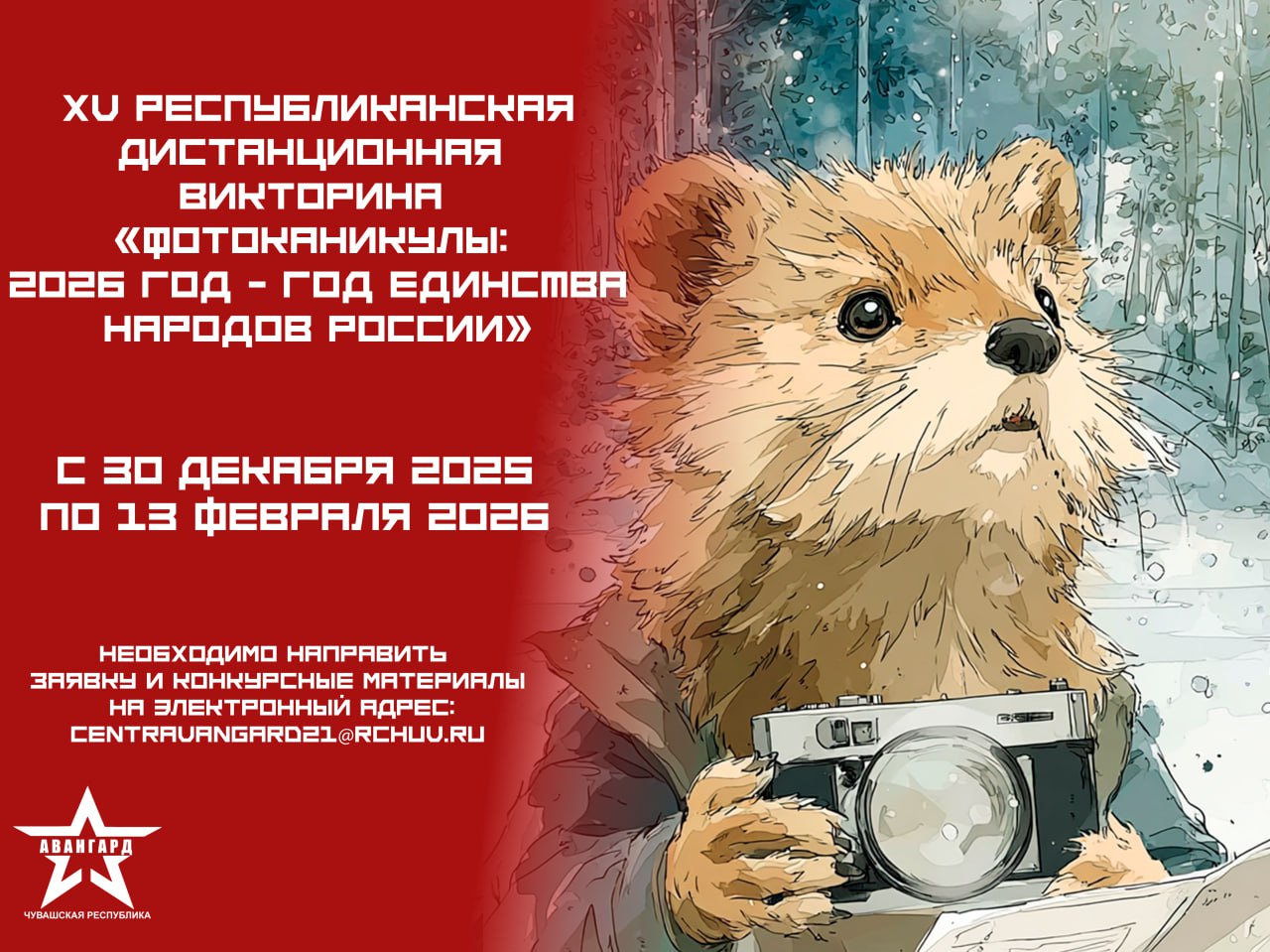 Для участия в викторине необходимо направить заявку и конкурсные материалы на электронный адрес centravangard21@rchuv.ru до 13 февраля 2026 года с указанием в теме письма «Фотоканикулы».