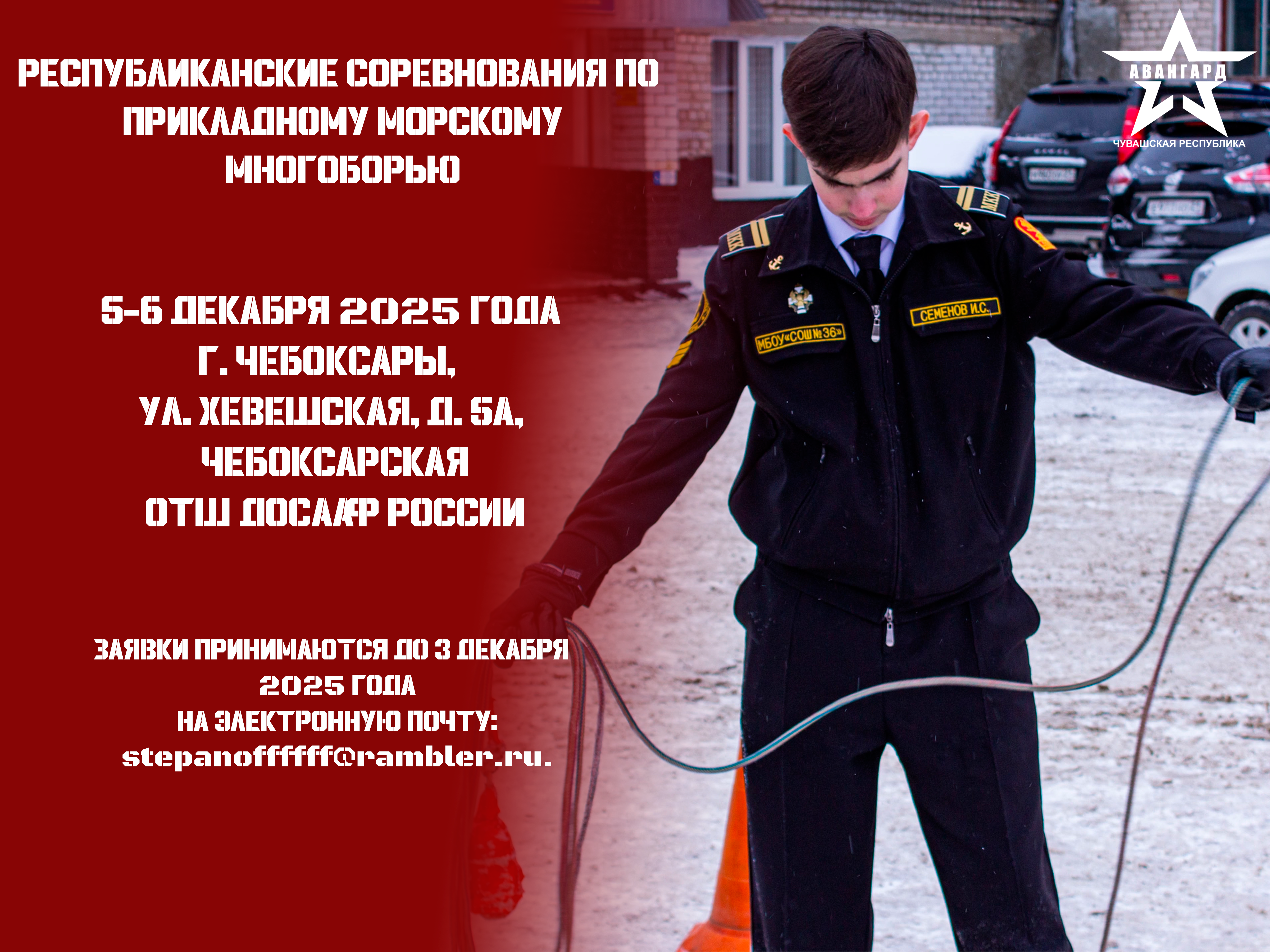 5-6 декабря 2025 года Чебоксарская ОТШ ДОСААФ России при поддержке ГАУ ЧР ДО «Центр АВАНГАРД» проводит Республиканские соревнования по прикладному морскому многоборью, посвященные Дню морской пехоты, в рамках Всероссийских состязаний по морскому многоборью «Морская зарница».