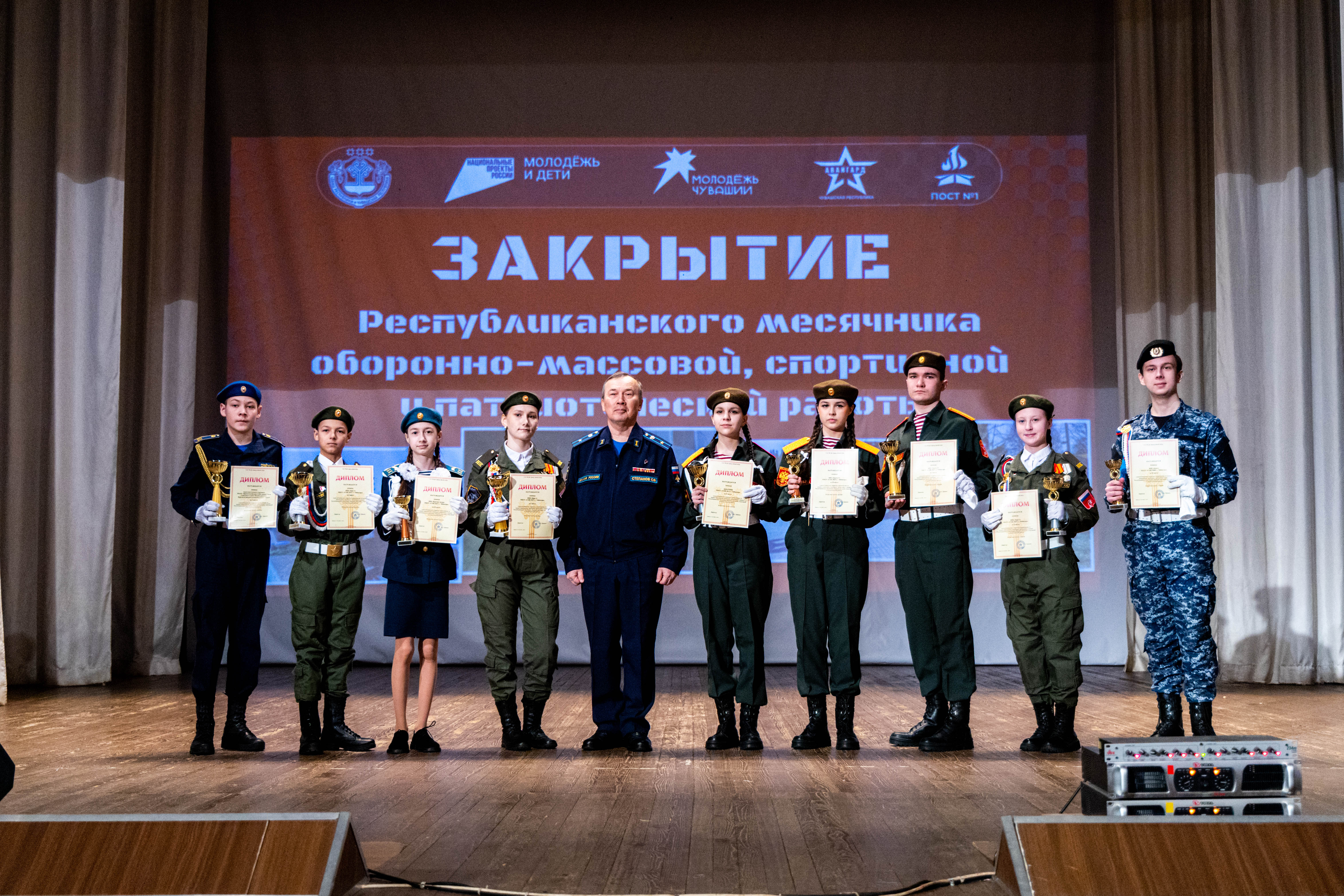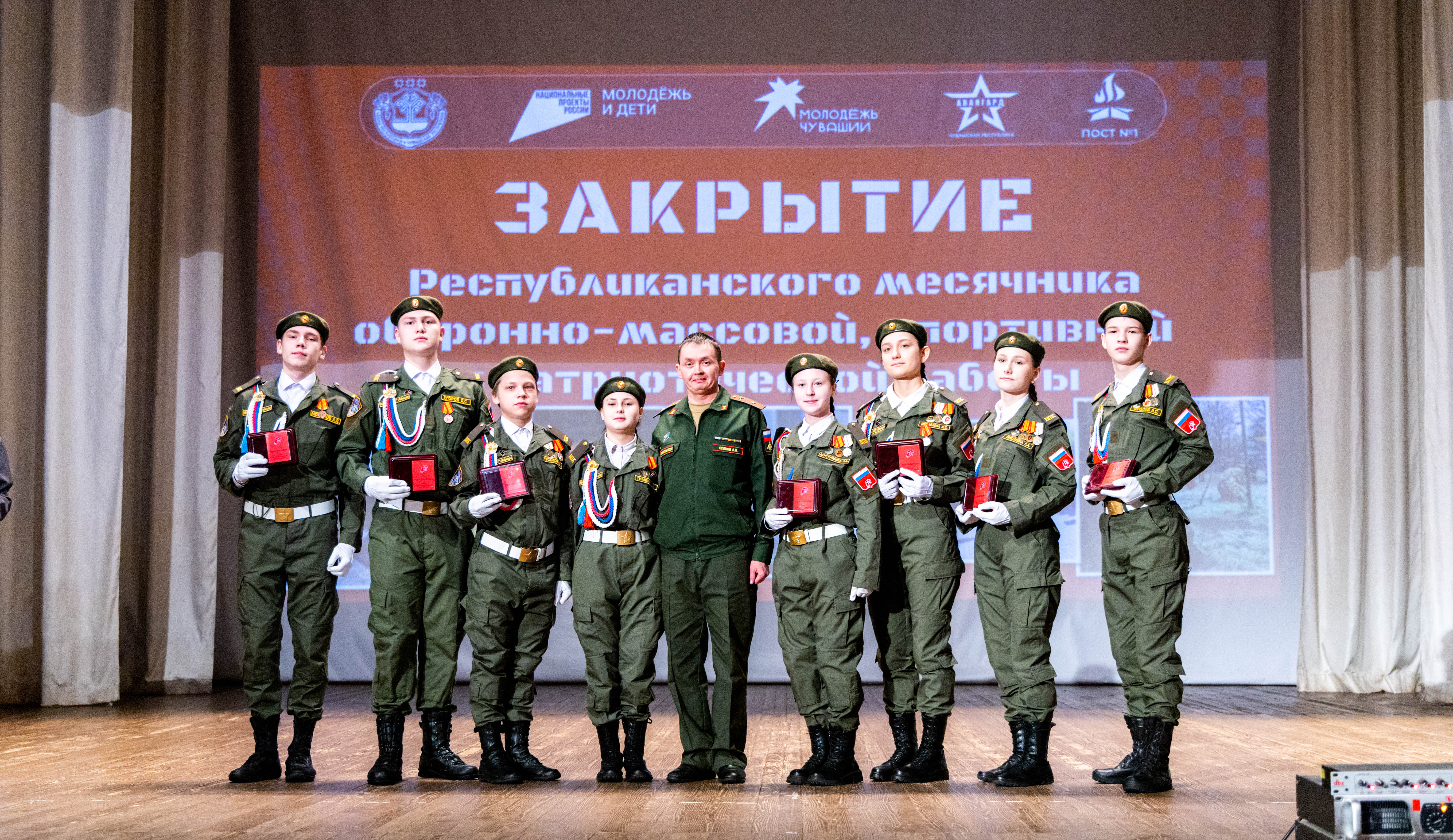 На торжественной церемонии закрытия прозвучали государственные гимны Российской Федерации и Чувашской Республики в исполнении обучающегося школы № 53 г. Чебоксары Павлова Ильи. Новочебоксарский кадетский лицей — победитель конкурса «Георгиевский бал» выступил с впечатляющим вальсом, а кадеты ВПК «Кредо» школы № 5 Новочебоксарска продемонстрировали строевое дефиле с флагами нашей страны.